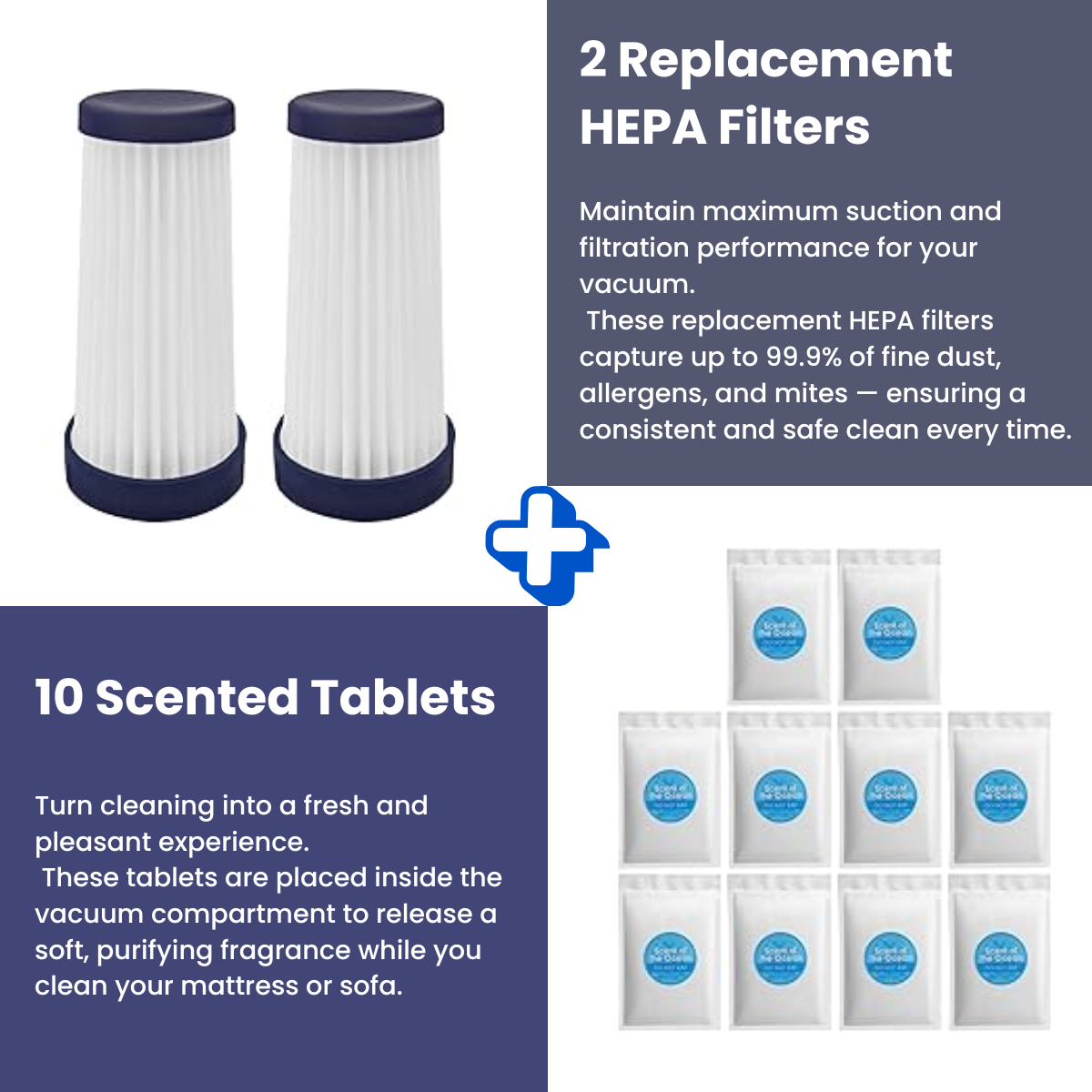 Enjoy a deeper, fresher clean without paying extra. Your vacuum comes with 2 spare HEPA filters to keep peak performance and 10 Aroma Tablets that leave a clean scent every time you use it.