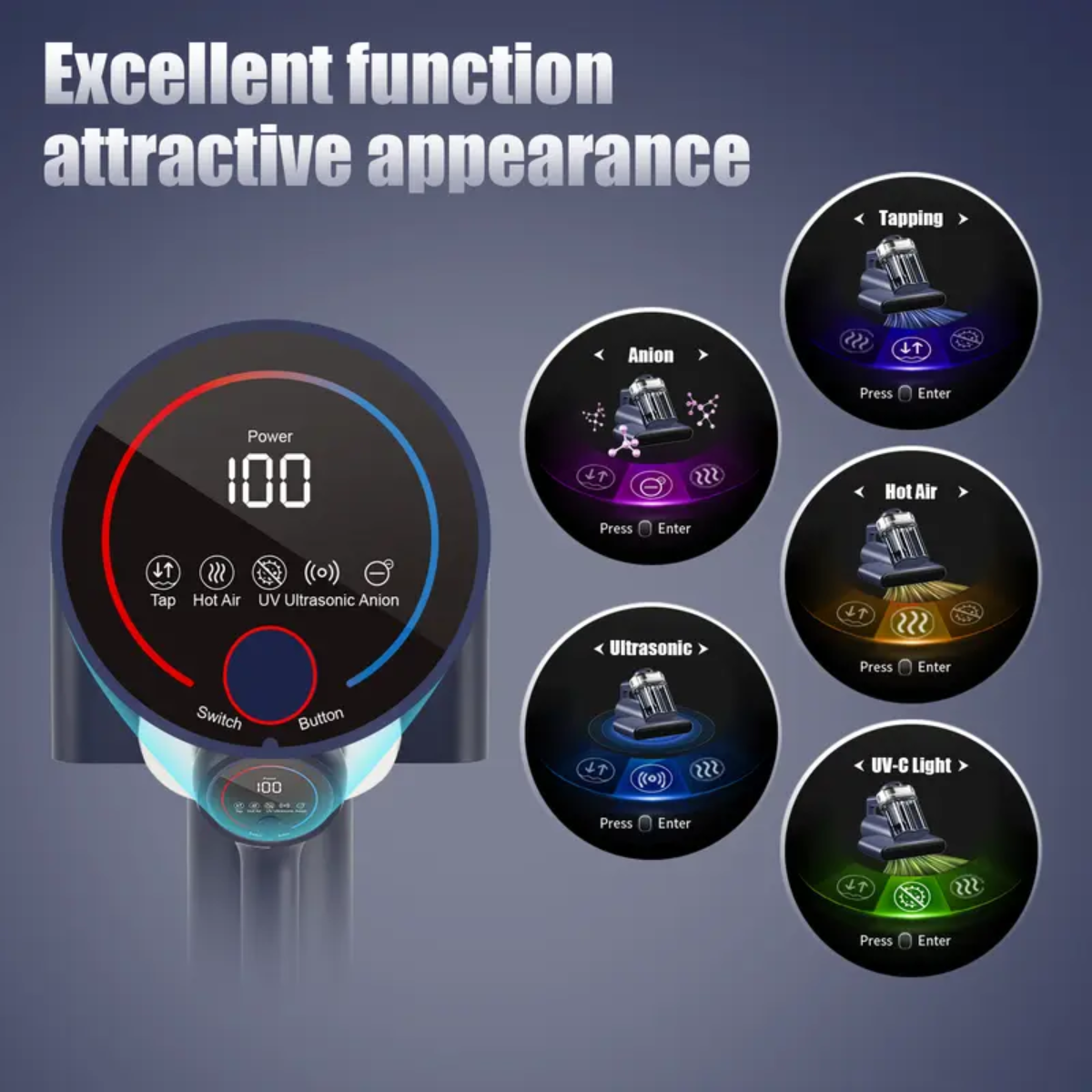 The vacuum combines powerful suction, UV-C light, vibration, and warm air to deep-clean mattresses, sofas, and thick fabrics.